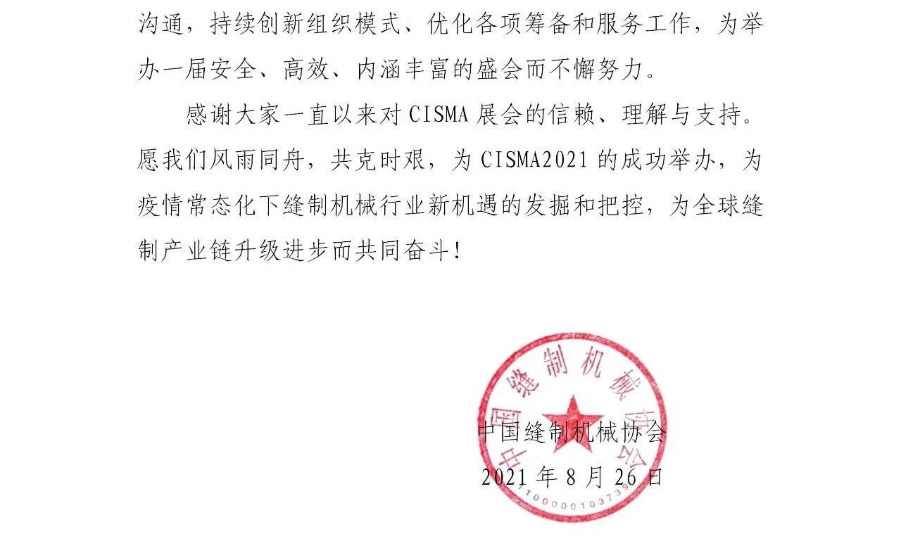 接主辦方通知,原定于2021年9月26-29日舉辦的“2021中國國際縫制設備展覽會(CISMA2021)”開展時間延期至2022年1月7-10日舉辦。