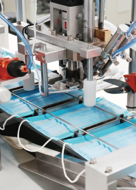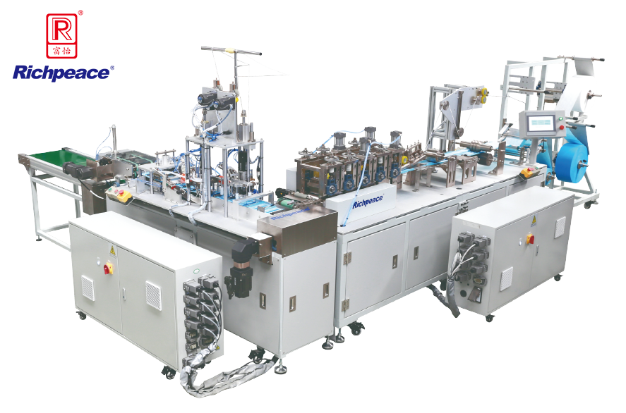 1.生產線采用“ 一拖一 ”的結構,自動送料、剪切鼻夾并完成口罩打片后, 自動傳送到耳帶工位焊接耳帶,并自動碼垛。