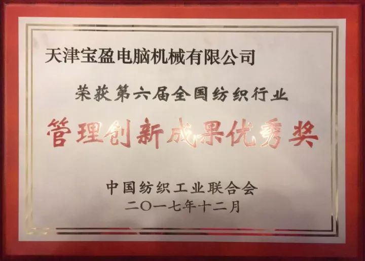 天津寶盈電腦機械有限公司榮獲“第六屆全國紡織行業管理創新成果優秀獎”。王俊玲總經理,獲得“管理創新成果主創者”稱號。