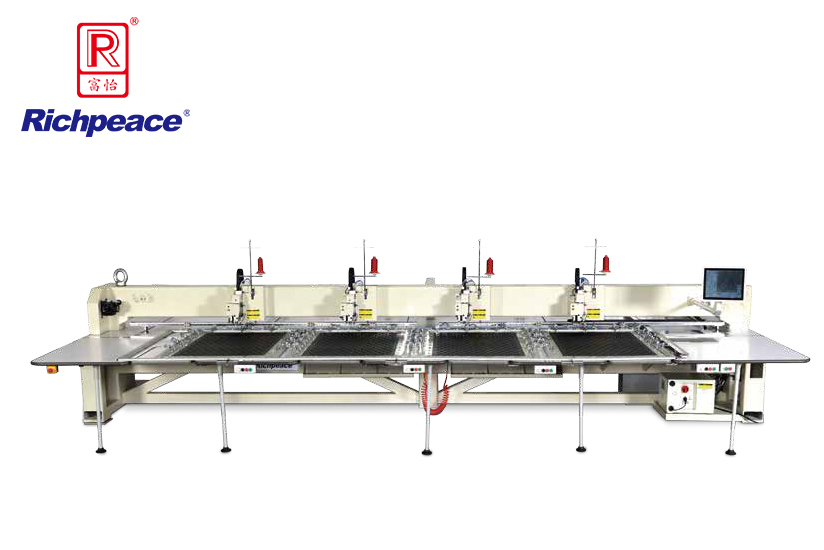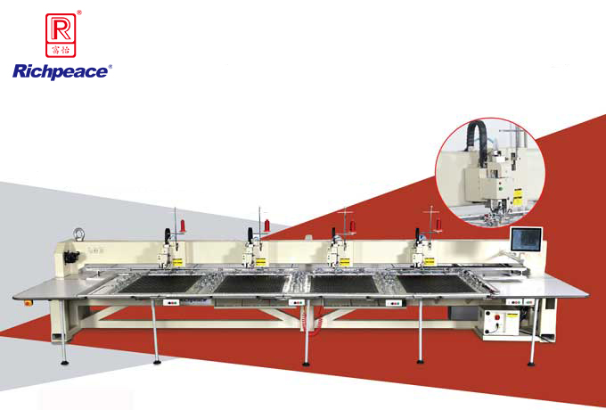 1、富怡全自動四頭皮革縫紉機升降式機頭,全自動電腦程序控制,取代一人一機人工操作平車的縫紉模式;