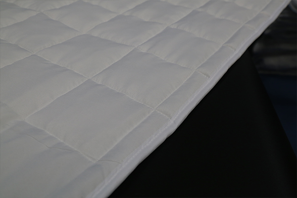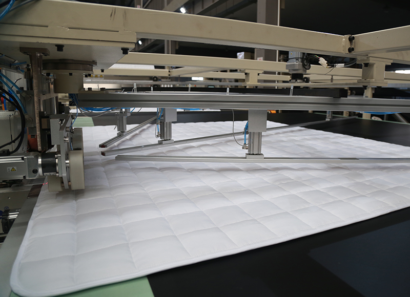 產線配置的絎縫機為大旋梭多針有梭絎縫機,工作速度高,可以匹配梳棉線使用,讓梳棉機產能得到充分釋放,機器厚度兼容性強,可以兼容夏涼被到冬被的不同克重產品的絎縫,同時機器針排位置可調,從而滿足對不同尺寸花型的調整;