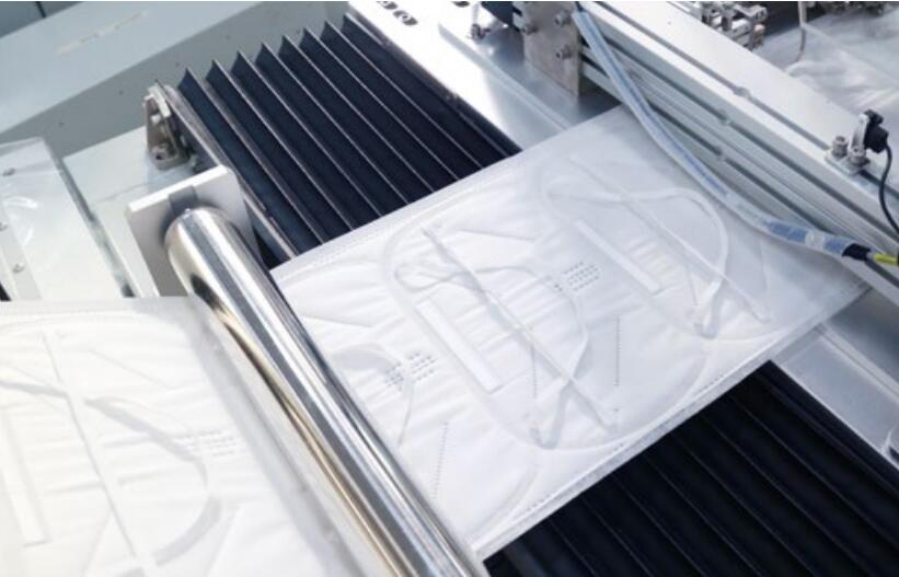 1、集上料、自動(dòng)上內(nèi)置鼻梁條、焊接口罩外輪廓、噴印、頭帶焊接、對(duì)折、封邊焊接、成型套切和廢料收集于一體,實(shí)現(xiàn)面料輸入到成品輸出完全在一臺(tái)設(shè)備上自動(dòng)化生產(chǎn)的高效智能模式。