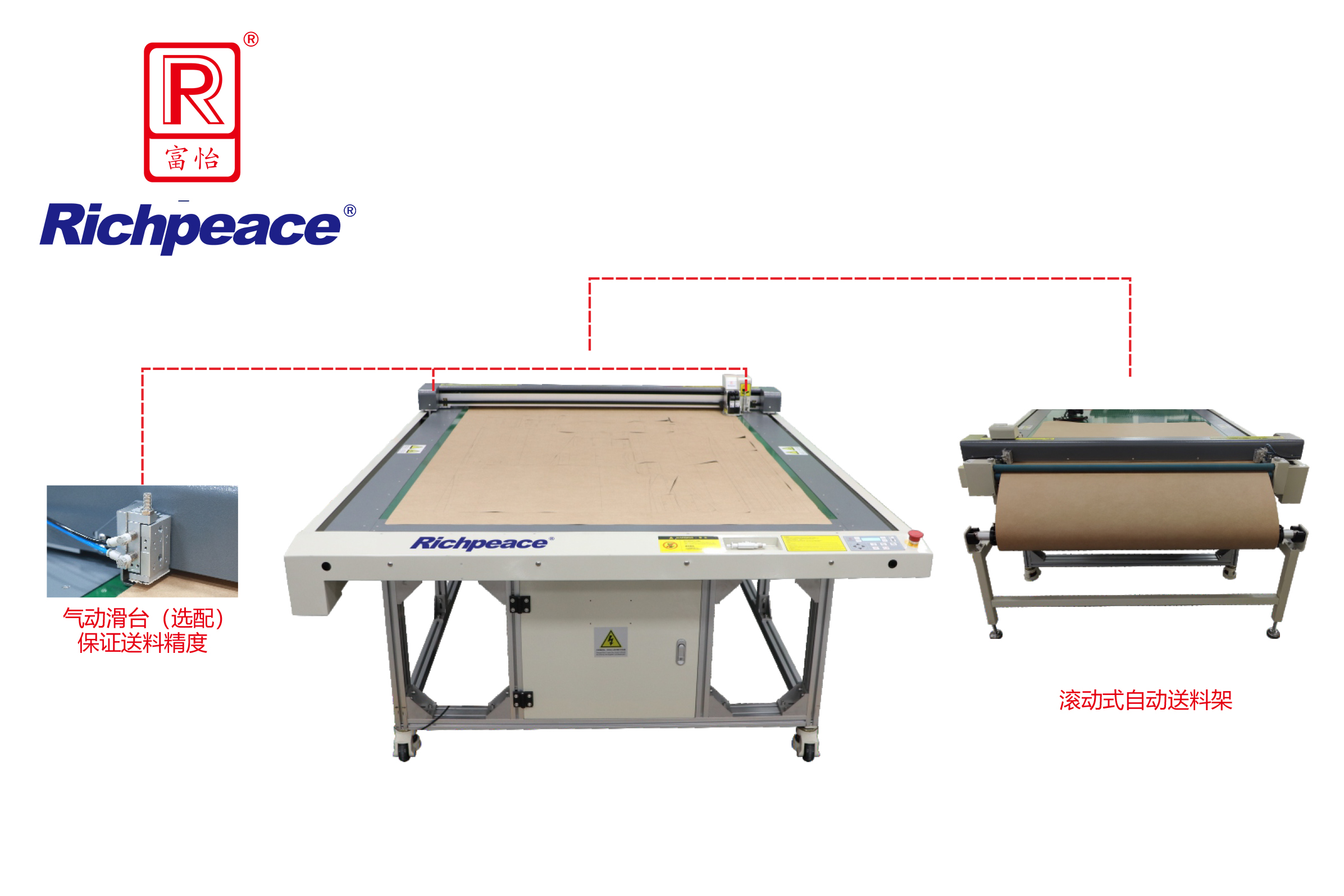 9、采用氣動滑臺夾取材料,保證送料精準度,實現超長圖形的 打印和切割(選配)。